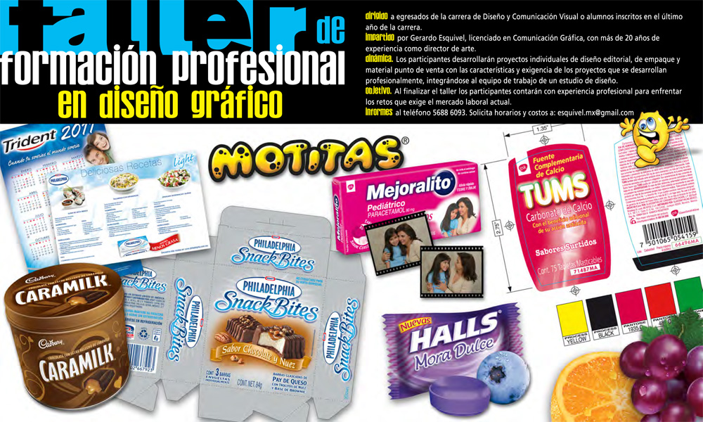 En el taller los participantes desarrollarán proyectos individuales de diseño editorial, de empaque y material punto de venta con las características y exigencia de los proyectos que se desarrollan profesionalmente, integrándose al equipo de un estudio de diseño. El objetivo es que al finalizar el taller, los participantes contarán con la experiencia profesional para enfrentar los retos que exige el mercado laboral.
